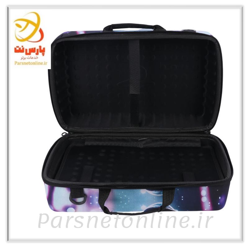حمل آسان با وجود دسته و بند دوشی همراه با قابلیت تنظیم ارتفاع بهره مندی از بند کشی داخلی، ساخته شده از جنس پارچه و پلاستیک مناسب برای قرارگیری کنسول پلی استیشن 5، دو دسته، هدست و کابل ها