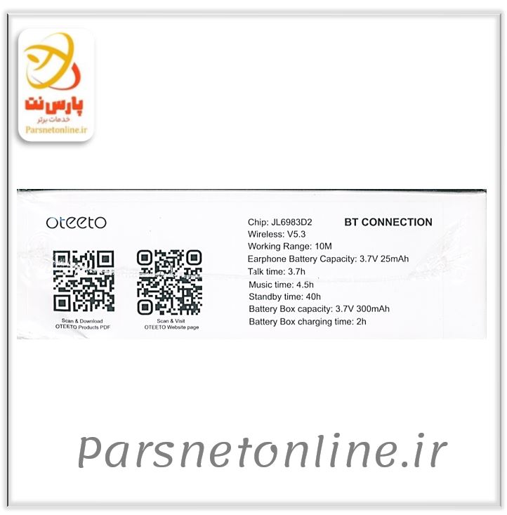 ایرفون بیسیم Oteeto مدل OT106 طرحی شبیه ایرپاد 4 دارد و با اتصال بیسیم و نسخه بلوتوث 5.3، ارتباط پایدار و سریعی را ارائه میدهد. این گوشی با فاصله پشتیبانی تا 10 متر و محدوده فرکانس 2.402-2.480GHz، عملکرد قوی و بدون قطعی را در محیطهای مختلف فراهم میکند. طراحی سبک و مدرن آن همراه با کنترل لمسی و ضربه زدن، امکان کنترل سریع محتوای پخش شده، قطع و اتصال تماس را فراهم میسازد.با ظرفیت باتری 300 میلیآمپر ساعت، این ایرفون توانایی پخش موسیقی تا حدود 4.5 ساعت و مکالمه تا 3.7 ساعت را در سطح صدای 80% دارد. شارژ با ولتاژ 5 ولت و جریان 1 آمپر، در مدت زمان حدود 2 ساعت انجام میشود و این میزان شارژ به طور کافی برای استفاده روزانه کافی است. این ایرفون با قابلیت کنترل لمسی و طراحی سبک، تجربهای راحت و مدرن از صدا و ارتباط ارائه میدهد.